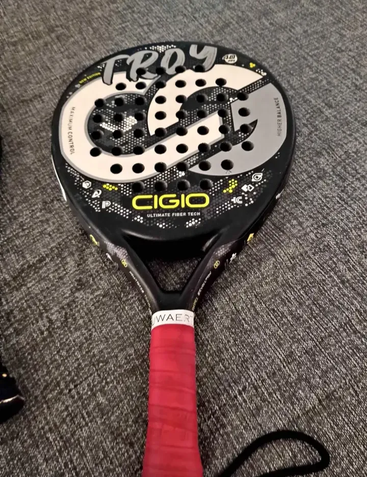 Raquete de Beach Tennis Cigio Troy em ótimo estado. Design moderno com detalhes em preto, amarelo e prata. Empunhadura vermelha para maior conforto. Ideal para jogadores que buscam controle e potência nos golpes. Pouco usada, pronta para brilhar nas quadras!