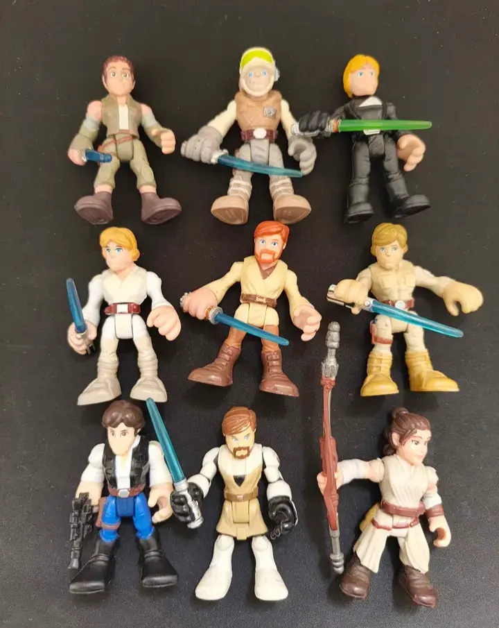 Lote com 9 bonecos da linha Galactic Heroes de Star Wars, com detalhes e em bom estado geral. Inclui Luke Skywalker, Obi-Wan Kenobi, Han Solo e Rey.