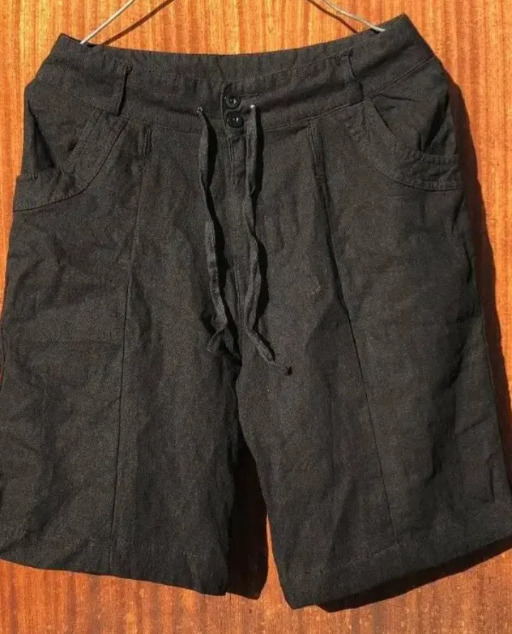 Bermuda feminina de sarja preta, tamanho a definir. Possui bolsos frontais e ajuste com cordão na cintura. Em bom estado de conservação.