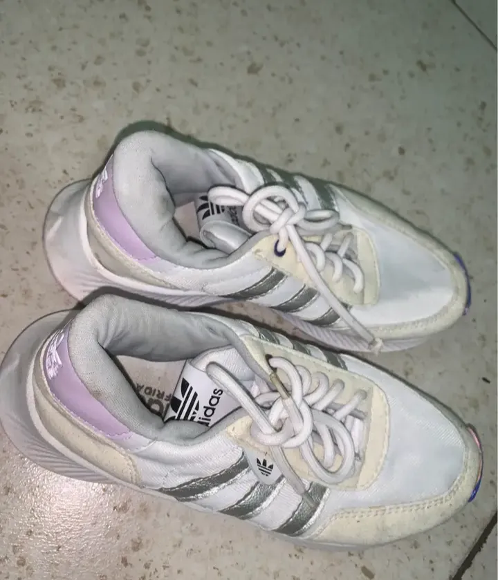 Tênis Adidas modelo Frida, cor branco com detalhes prateados e lilás. Usado, porém em bom estado.