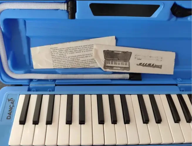 Melódica da marca Dança, cor azul, em ótimo estado! Acompanha tudo: mangueira, bocal e estojo original. Ideal para músicos iniciantes e experientes. Sem marcas de uso visíveis.