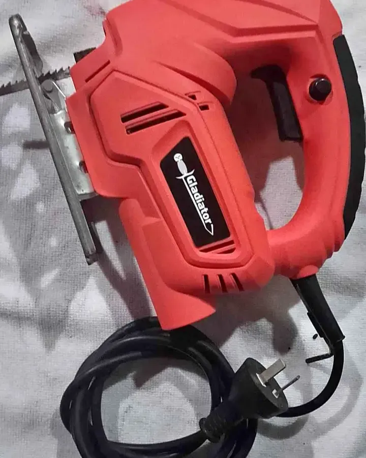 Serra Tico-Tico elétrica da marca Gladiator, cor vermelha e preta. Em bom estado de conservação, pronta para uso em seus projetos de marcenaria e bricolagem.