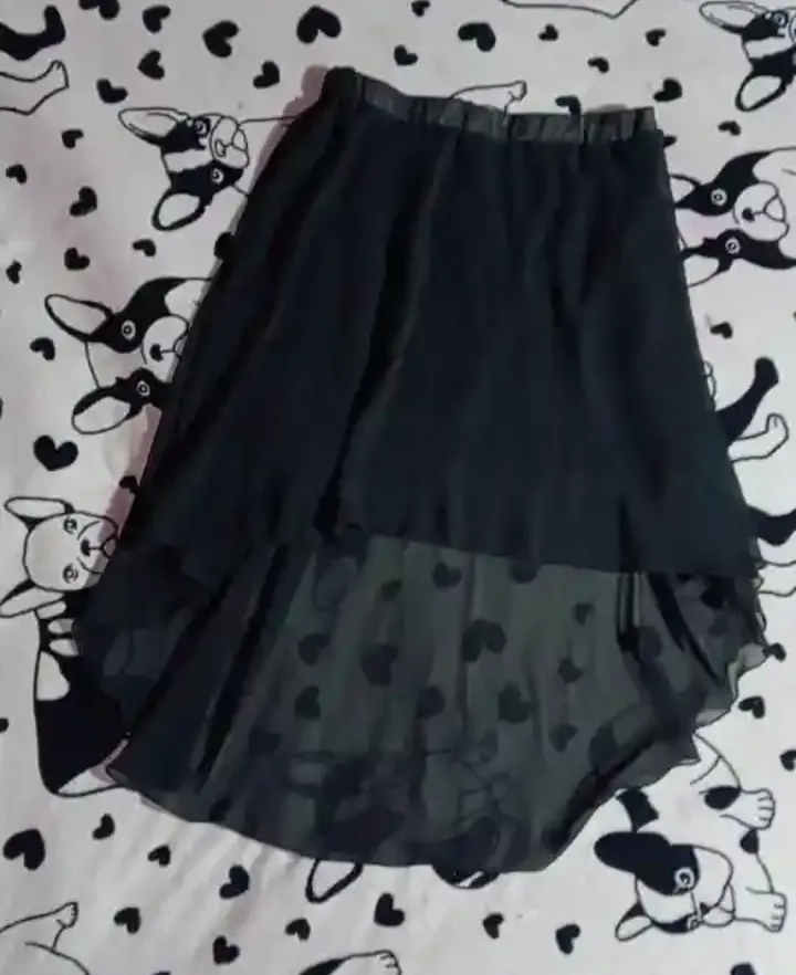 Saia preta com corte assimétrico e detalhes em corações. Possui forro e elástico na cintura para melhor ajuste. Em ótimo estado de conservação.