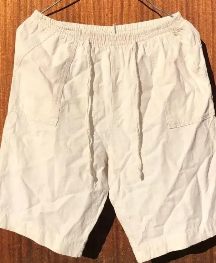 Bermuda em sarja de algodão cor off-white, com elástico e cordão na cintura para ajuste. Possui bolsos frontais e modelagem reta, ideal para o dia a dia. Em bom estado de conservação.