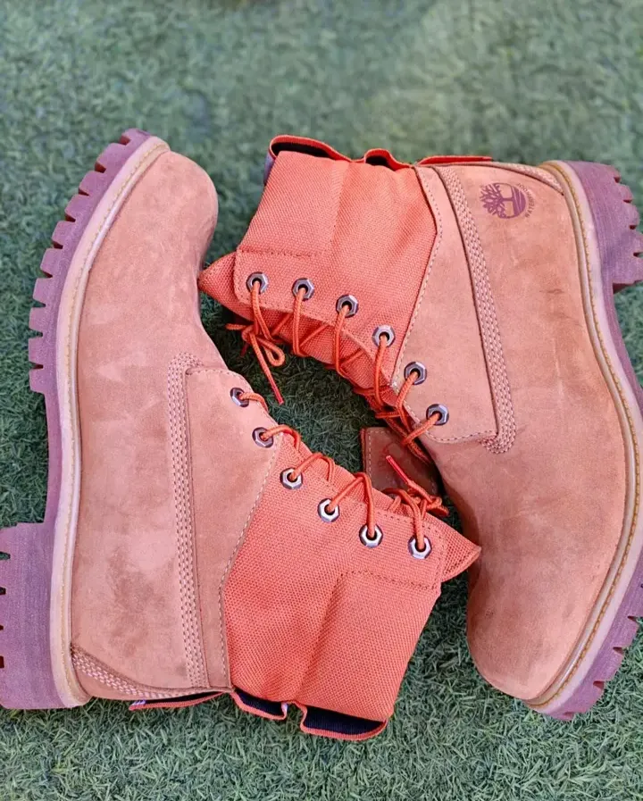 Botas Timberland impermeáveis, cor mel clara com detalhes em laranja vibrante. Em bom estado, ideais para aventura e estilo. Prontas para a sua próxima troca!