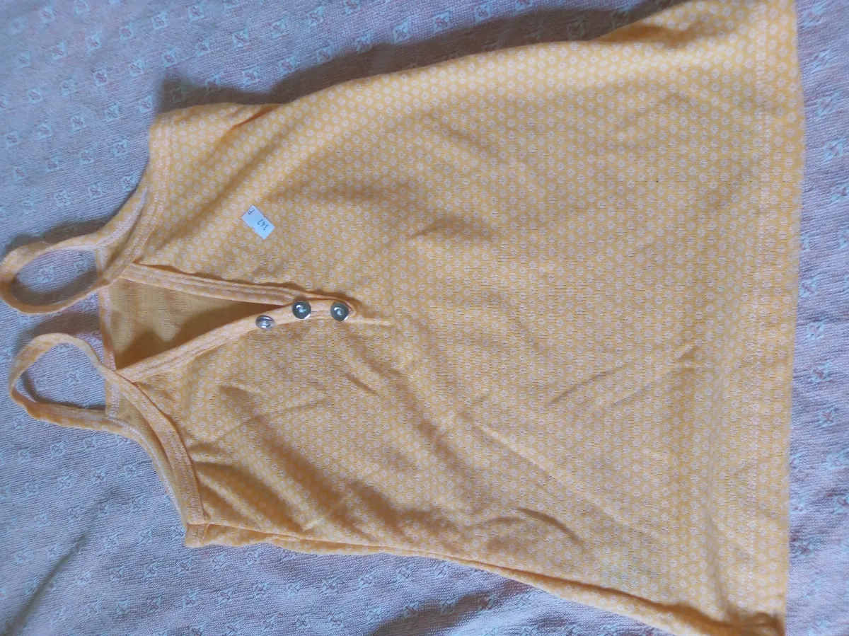 Linda regata amarela com estampa delicada, tamanho P. Possui botões frontais e alças finas. Em ótimo estado de conservação, ideal para o verão!