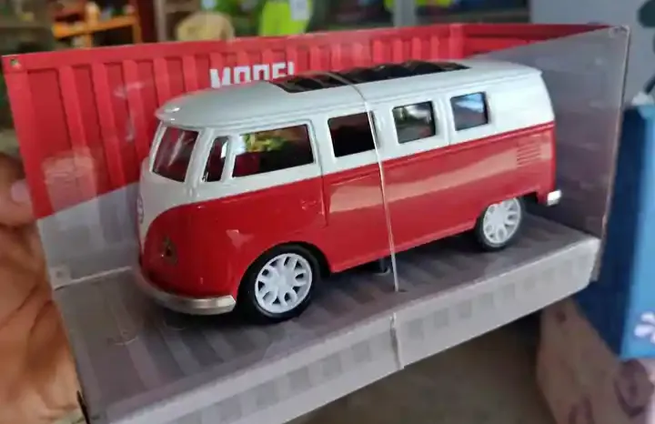 Miniatura de Kombi Volkswagen, modelo antigo, na cor vermelha e branca. Em bom estado, na embalagem original.