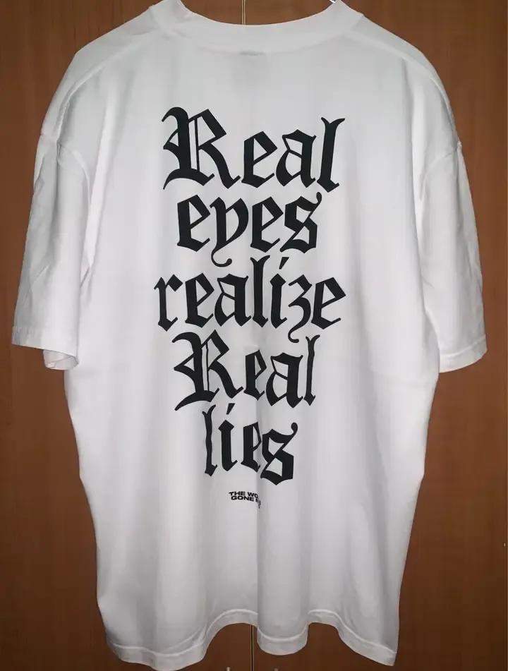 Camiseta branca com estampa marcante em fonte gótica "Real eyes realize real lies". Em ótimo estado. Ideal para quem busca um visual diferenciado e com atitude. Confira as fotos!
