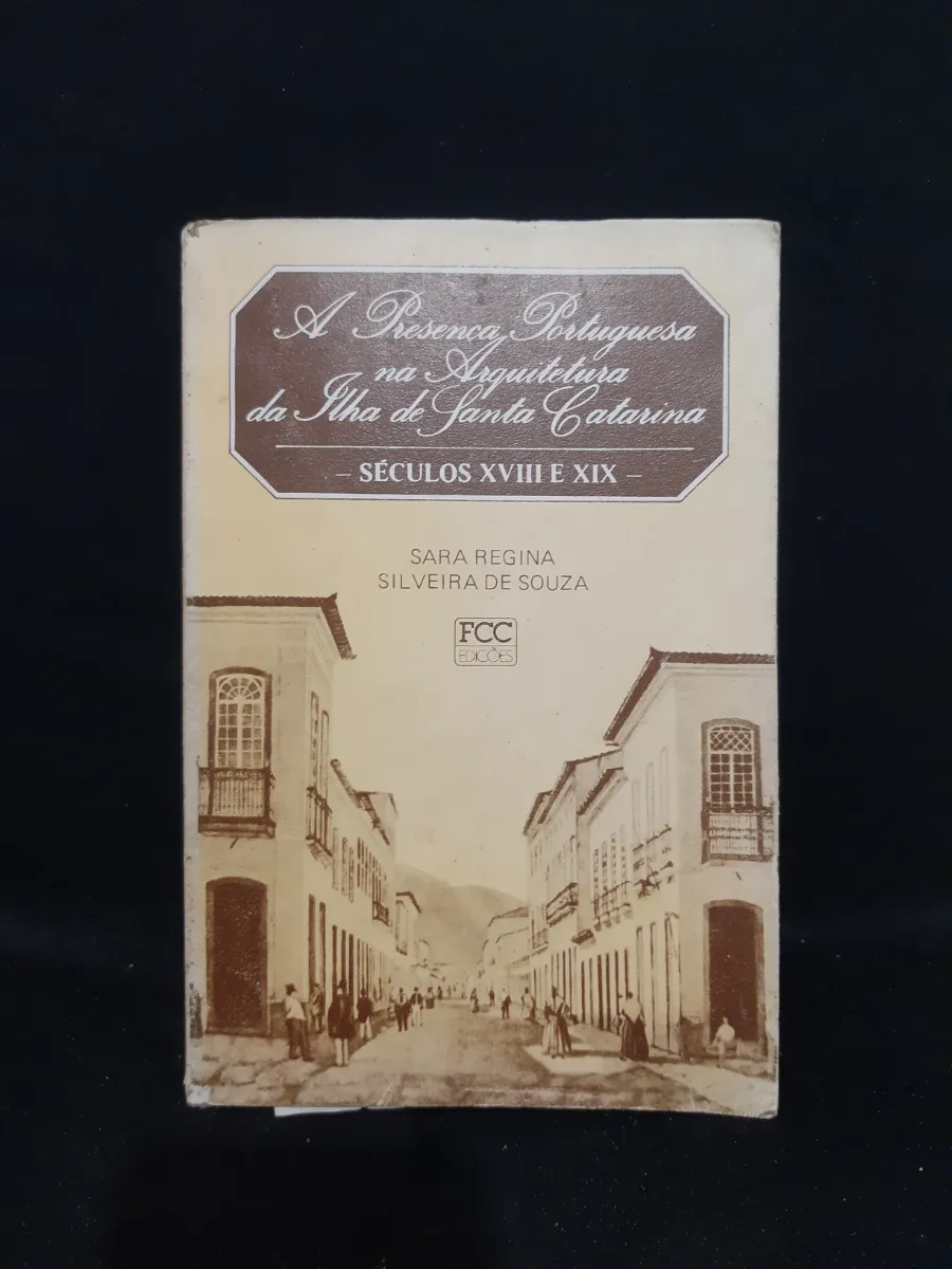 Livro "A Presença Portuguesa na Arquitetura da Ilha de Santa Catarina - Séculos XVIII e XIX" de Sara Regina Silveira de Souza. FCC Edições. Capa com ilustração de rua antiga. Bom estado, com pequenos sinais de uso nas bordas.