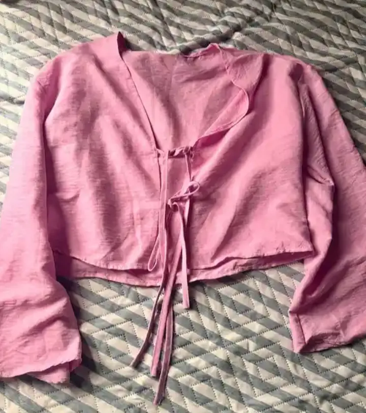 Blusa cropped rosa claro com mangas largas e amarração frontal. Possui um leve brilho no tecido.