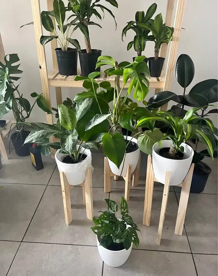 Diversas plantas ornamentais em vasos brancos e pretos, incluindo Monstera, Dieffenbachia e outras. Algumas com suporte de madeira. Todas em ótimo estado, prontas para dar um toque de verde ao seu lar! Ideal para amantes de plantas.