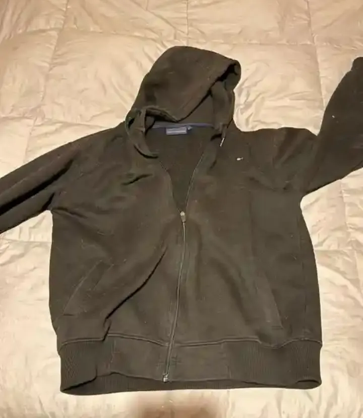 Blusa de moletom preta da Tommy Hilfiger com zíper e capuz. Usada, com alguns sinais de uso, mas em bom estado geral. Ideal para o dia a dia e para um look casual.