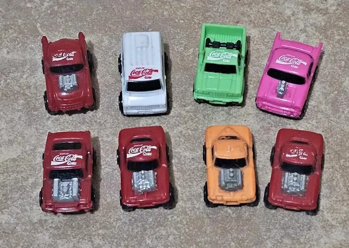 Coleção de miniaturas Coca-Cola em bom estado. São 8 carrinhos diferentes com design nostálgico dos anos 90, em diversas cores vibrantes. Ideal para colecionadores!