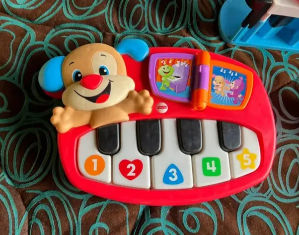 Pequeno piano infantil da Fisher-Price com design de cachorrinho. Possui teclas coloridas com números e botões com desenhos de animaizinhos. Em bom estado.
