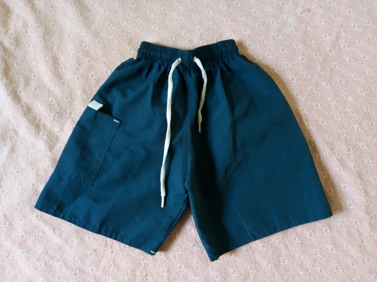 Bermuda masculina azul escura, tamanho M, com elástico na cintura e cordão branco. Possui um bolso lateral com detalhe em branco. Em ótimo estado.