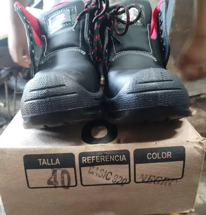 Bota de segurança preta, tamanho 40, nova na caixa. Ideal para construção civil, indústria e outros trabalhos que exigem proteção. Cadarços pretos com detalhes em vermelho. Veja as fotos!