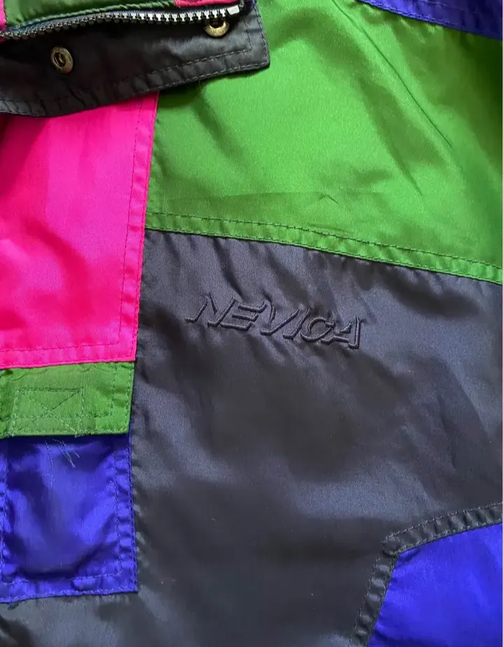 Jaqueta vintage da marca Nevica, com design color block vibrante em tons de rosa, verde, azul e preto. Ideal para quem busca um visual único e estiloso. Em bom estado de conservação.