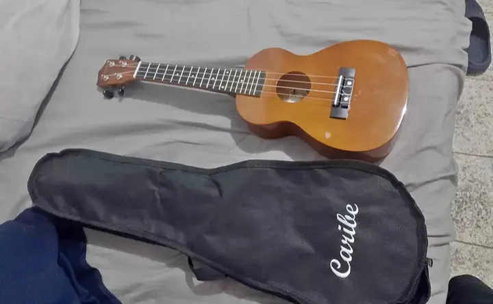 Ukulele Caribe em ótimo estado, cor marrom clara, acompanha capa protetora original. Ideal para iniciantes e amantes da música!