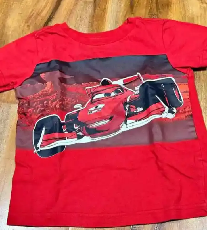 Camiseta vermelha infantil com estampa do personagem Relâmpago McQueen, do filme Carros. Em bom estado.