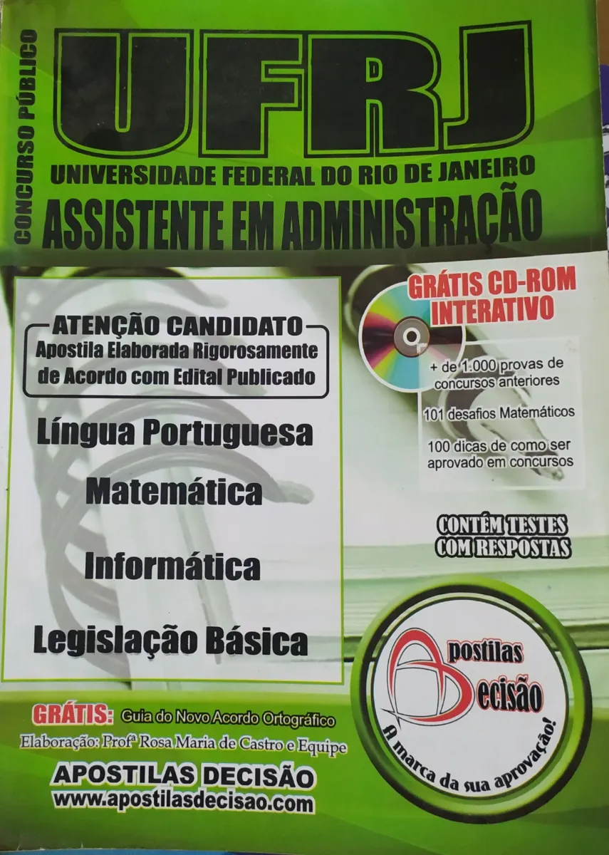 Apostila para o concurso da UFRJ para o cargo de Assistente em Administração. Inclui CD-ROM interativo com provas anteriores e guia do novo acordo ortográfico.