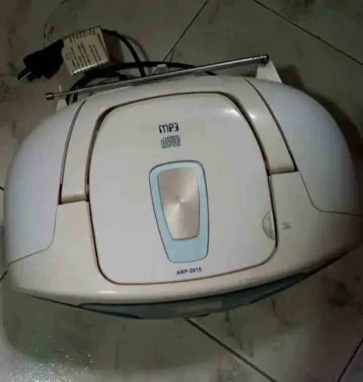 Rádio CD player MP3 funcionando perfeitamente. Modelo antigo, cor branca com detalhes em azul. Possui antena e entrada para fone de ouvido. Ideal para quem curte um som de qualidade!