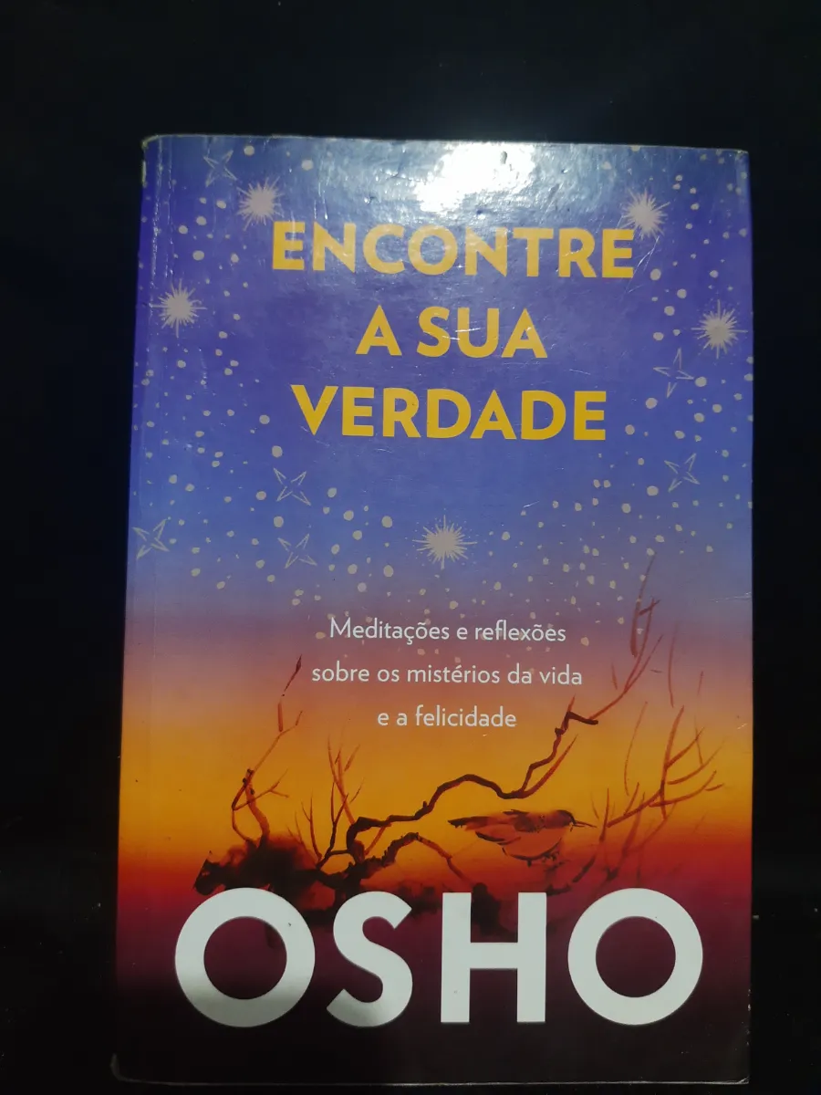 Livro de capa dura 'Encontre a Sua Verdade' de Osho. Meditações e reflexões sobre os mistérios da vida e a felicidade. Capa com detalhes em azul, amarelo e laranja. Em bom estado.