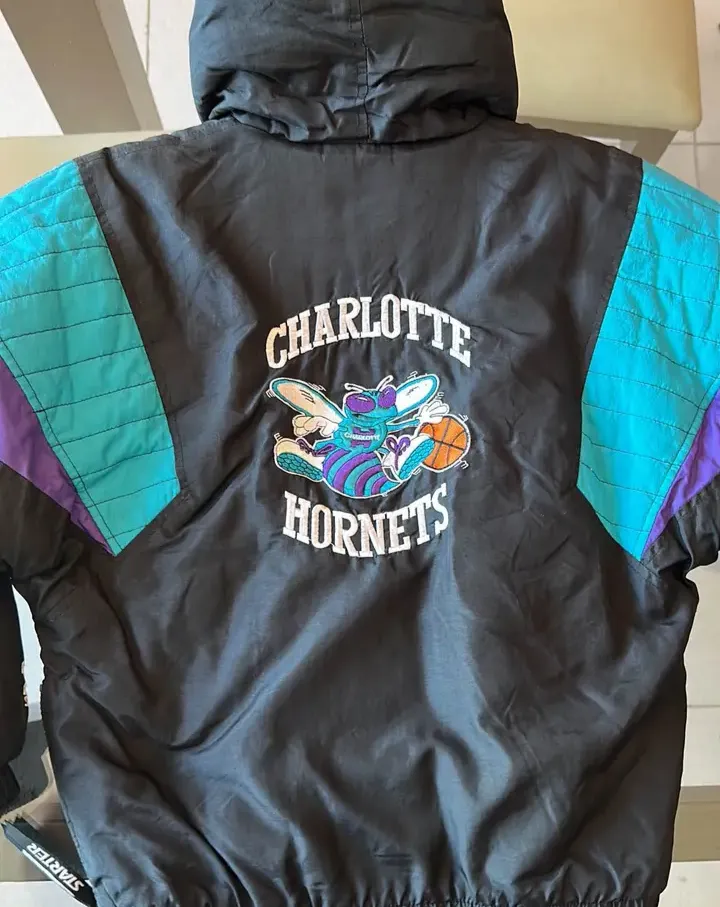 Linda jaqueta vintage da Charlotte Hornets, original Starter, em excelente estado de conservação. Detalhes em turquesa, roxo e preto, com o logo bordado nas costas. Ideal para fãs de NBA e colecionadores!