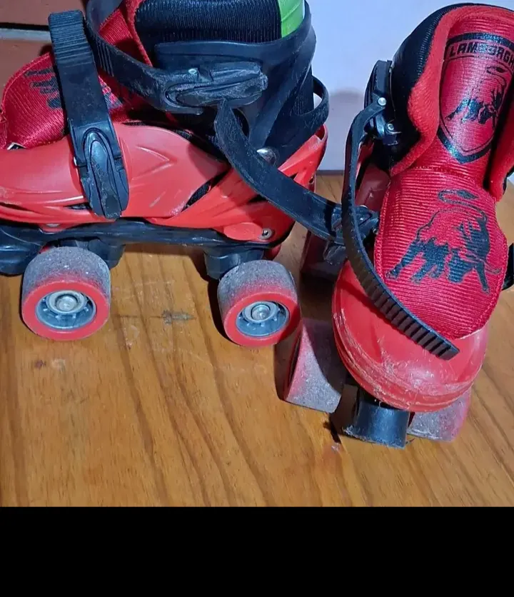 Patins infantil da Lamborghini, cor vermelha, com sinais de uso nas rodas e na estrutura. Ideal para quem está começando a patinar. Ajuste por presilha.