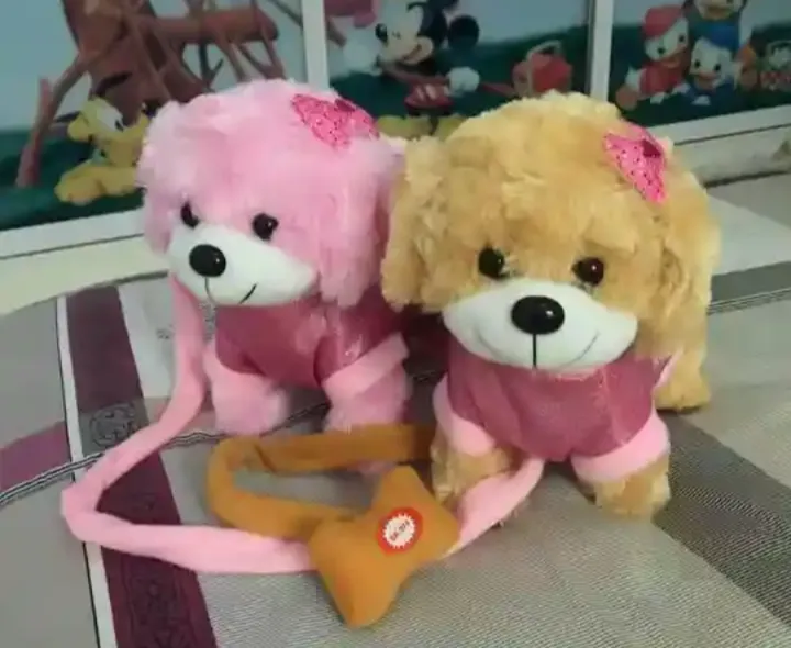 Dois cachorros de pelúcia, um rosa e um bege, com roupinhas rosas brilhantes e laços brilhantes na cabeça. Acompanham guia/coleira rosa e acessório em formato de osso.