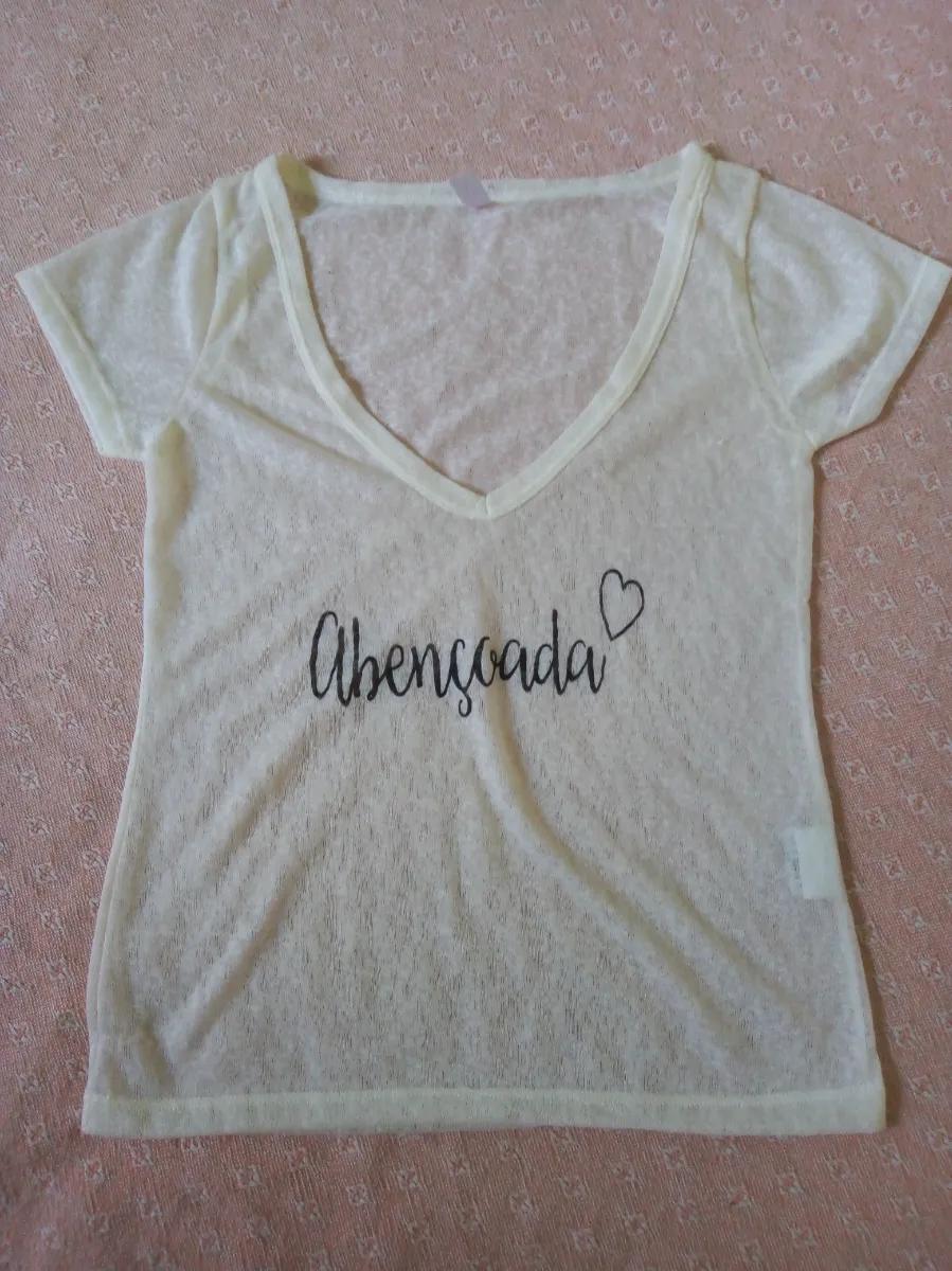 Blusa feminina off white, tecido levemente transparente, com decote em V e estampa "Abençoada" com um coração. Em ótimo estado.
