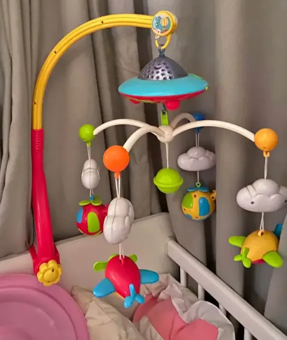 Móbile musical infantil em ótimo estado, com cores vibrantes e design encantador de aviões, helicópteros e nuvens. Ideal para entreter e estimular o desenvolvimento do seu bebê. Possui luzes e melodias suaves.